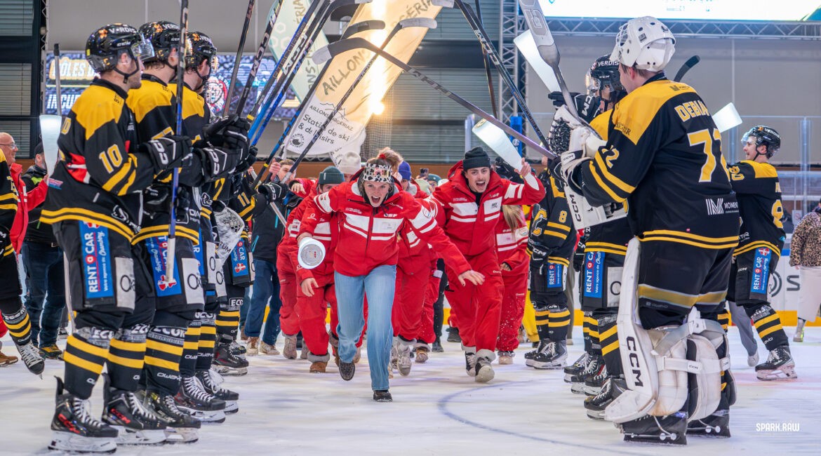 Il ne fallait pas revenir en retard du Bercail après la pause car ce n’est qu’au bout de 30 secondes de jeu qu’Hugo Letellier entame la remontada chambérienne, après un premier tir qui n’était pas passé [3-4]. On ressent une véritable urgence des Éléphants à inverser le cours du match. Ils multiplient les assauts face à Andrei Filonenko. Et pourtant, ils ne parviennent pas à tirer avantage de leur double supériorité numérique pendant 1’39… Le tir de Robin Guidoux se heurte (encore !) au poteau du but. Puis, sur un énorme tir de Tanguy Franzini, c’est la délivrance. Les Éléphants égalisent [4-4] et la patinoire, une fois de plus à guichets fermés, exulte ! Dans une nouvelle situation de supériorité numérique, Hugo Raveaud comble encore plus les espoirs du public en redonnant l’avantage aux siens [5-4], assisté par Jure Povse et Stepan Kolonin. Très peu de temps après, Enzo Rotolo se rend coupable d’un faire trébucher sifflé immédiatement par l’arbitre. Malgré l’interruption du jeu, le Nocéen (et double buteur) Cullen McLean charge dangereusement Tanguy Franzini à la tête, qui s’effondre. Visiblement peu en accord avec la sanction de 5 minutes qui lui est infligée, il proteste avec véhémence auprès du corps arbitral qui l’envoie au vestiaire. Et alors qu’il reste un peu plus de 6 minutes à jouer et que l’écart n’est que d’un but, l’équipe de Neuilly-sur-Marne quitte la glace et se dirige elle aussi vers le vestiaire, devant un public médusé qui ne tarde pas à manifester sa désapprobation. Après un moment de flottement face à cette situation Ô combien inédite, la fin de la rencontre est officiellement annoncée, synonyme de victoire pour les Éléphants, qui laissent éclater leur joie.